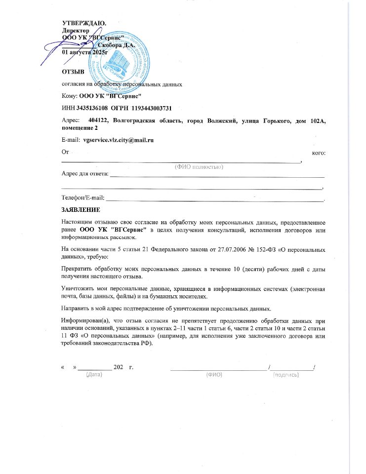 Форма отзыва согласия на обработку ПД